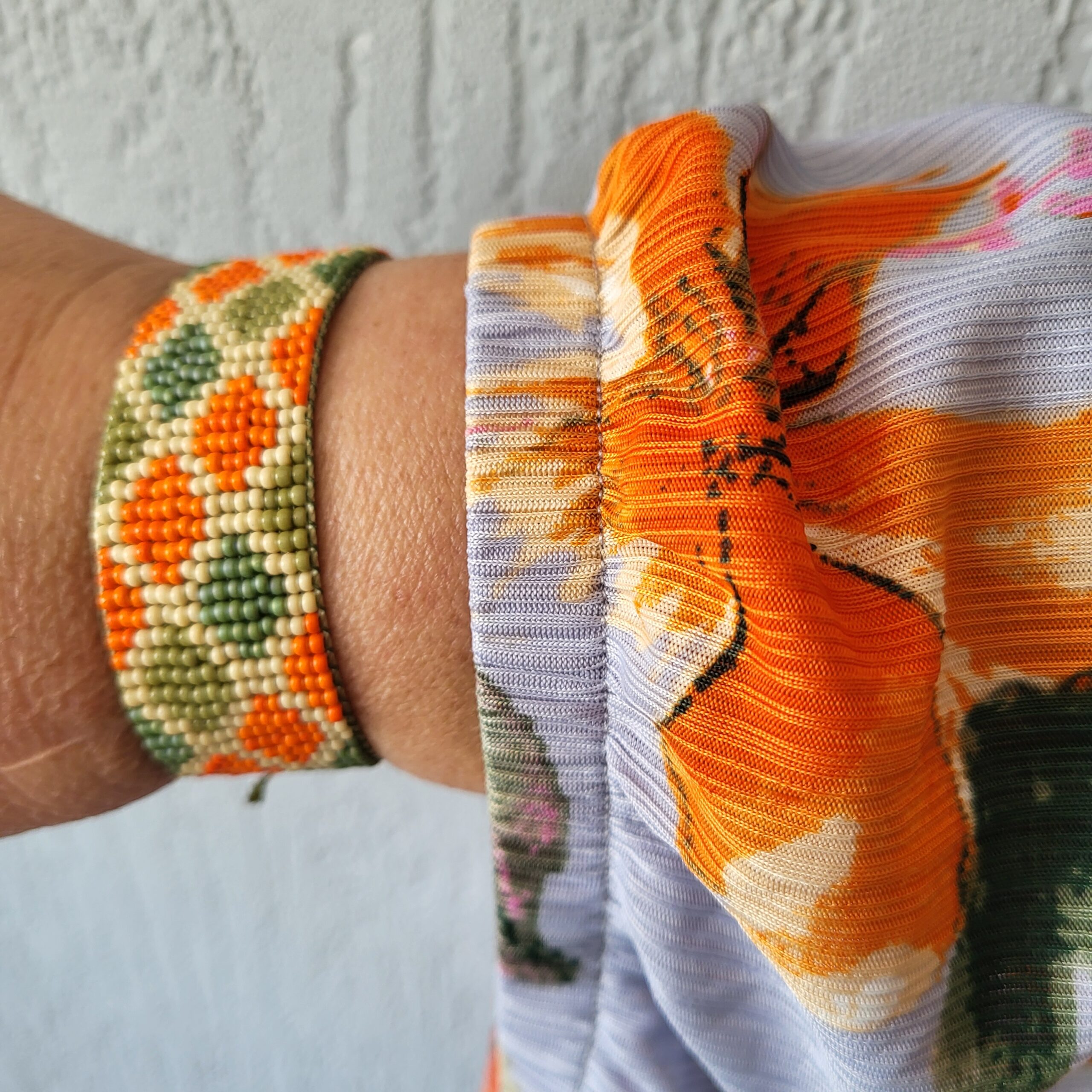 Onlangs heb ik vier leuke zomerse bloesjes aangeschaft en zat ook met hetzelfde probleem. Mijn bloesjes hebben alle vier veel verschillende kleuren en motieven. Bij het ontwerpen van een bijpassende armband kijk ik eerst naar het motief en probeer dit om te zetten in een ontwerp voor de armband. In dit geval heb ik gekozen voor een heel ander motief, maar wel met dezelfde kleuren als het bloesje. Waarom? De bloemen op het bloesje hebben geen strakke contouren en hebben allemaal uitlopers. Het zou erg moeilijk zijn om iets vergelijkbaars te maken. Daarom heb ik gekozen voor een strak motief. In het begin dacht ik dat het misschien niet zou passen omdat het een ander motief is dan het bloesje, maar eigenlijk past het perfect bij elkaar. Ik ben erg blij met het resultaat.