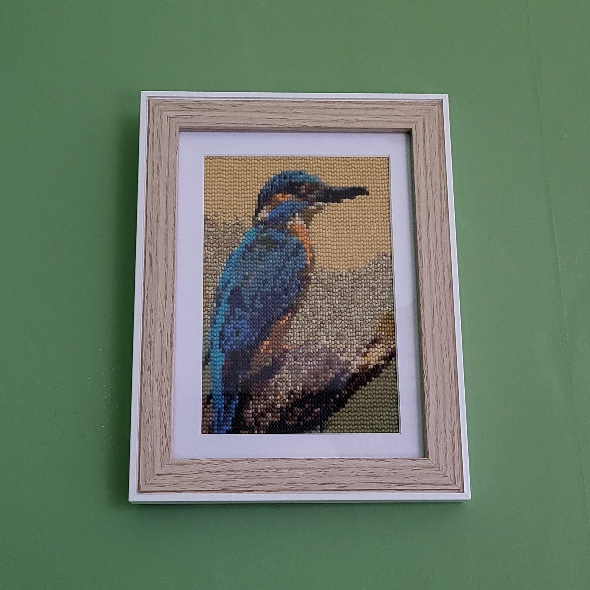 Voor dit schilderij heb ik 83 rijen gespannen, wat de maximale grootte is die ik kan maken met mijn weefraam. Het is 75 rijen kralen lang. Voor deze ijsvogel zijn 31 verschillende kleuren gebruikt. De kleuren die er echt uitspringen en perfect bij de ijsvogel passen, zijn voor blauw: 11-4480 (Underwater blue) en 11-413 (Turquoise blue). Deze specifieke kleuren zijn te vinden op zijn vleugels en hoofd. Voor oranje heb ik de 11-4454 (Kumquat) gebruikt, te vinden op zijn borst en onder zijn oog.