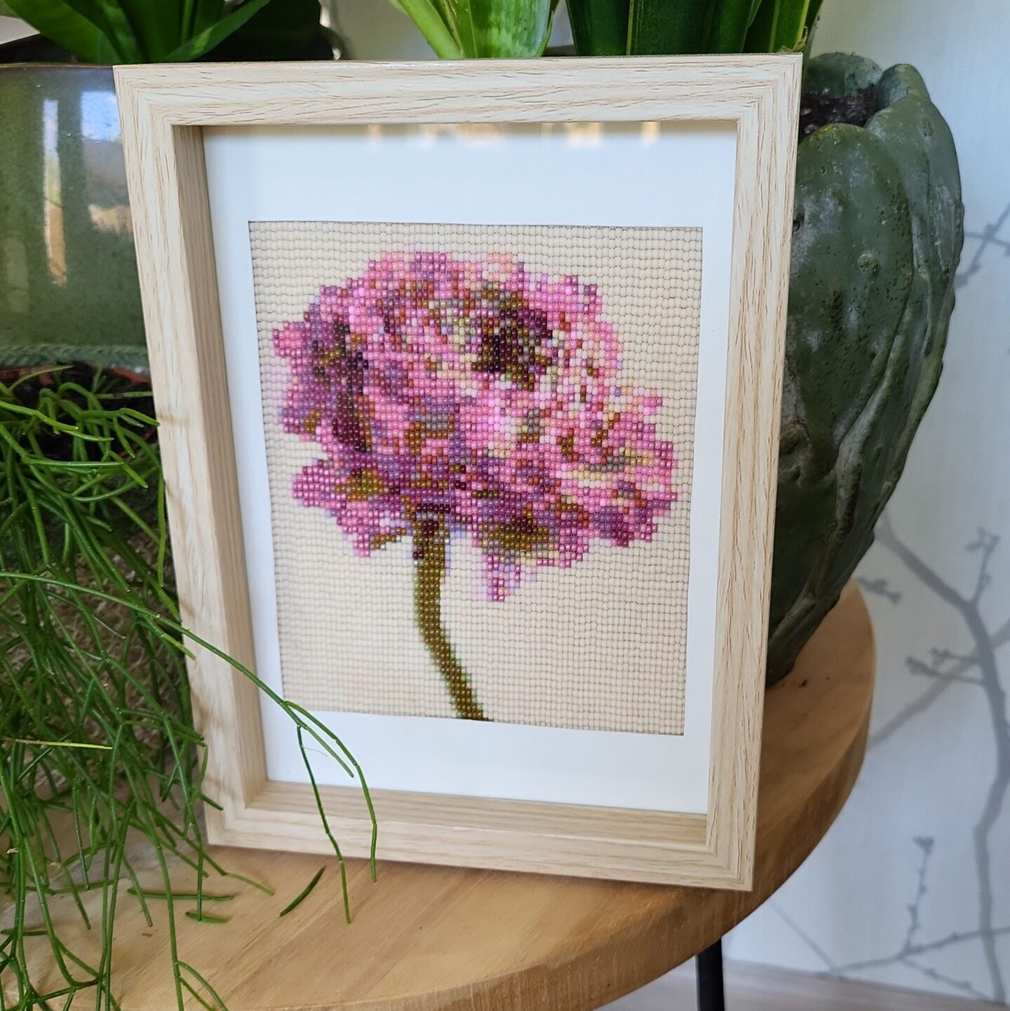 Het maken van dit schilderij had meerdere uitdagingen. Allereerst vroeg ik me sterk af of ik deze tere bloem met al die blaadjes genuanceerd op de ‘kraal’ kon krijgen. Ik heb vanuit het origineel een aantal kleuren aan moeten passen om meer diepte te krijgen. Uiteindelijk heb ik het schilderij kunnen weven in 33 kleuren. En ik ben meer dan tevreden met het resultaat.