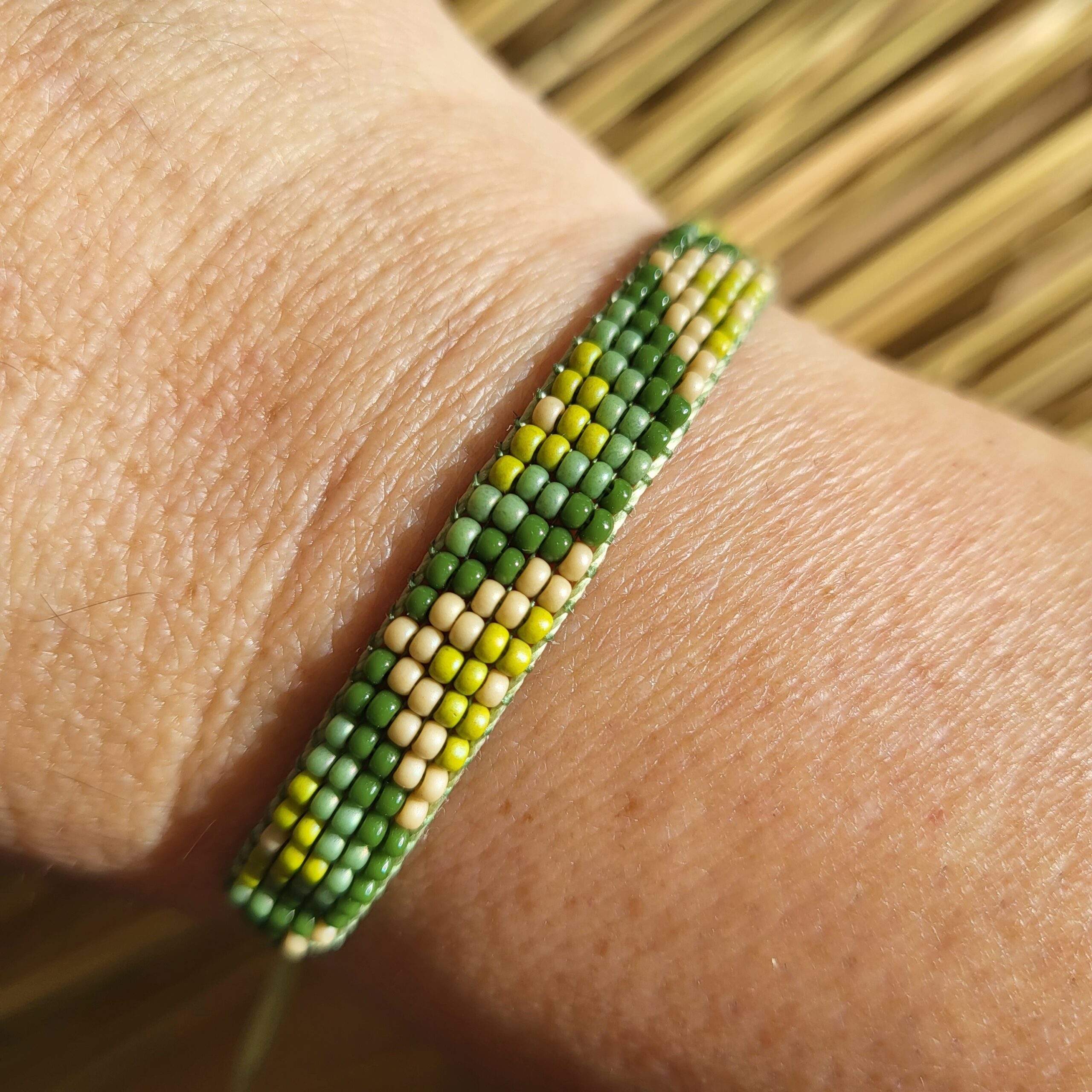 Deze brede armband bestaat uit 25 rijen en maar liefst 7 verschillende kleuren. Door de subtiele kleurovergangen ontstaat er …