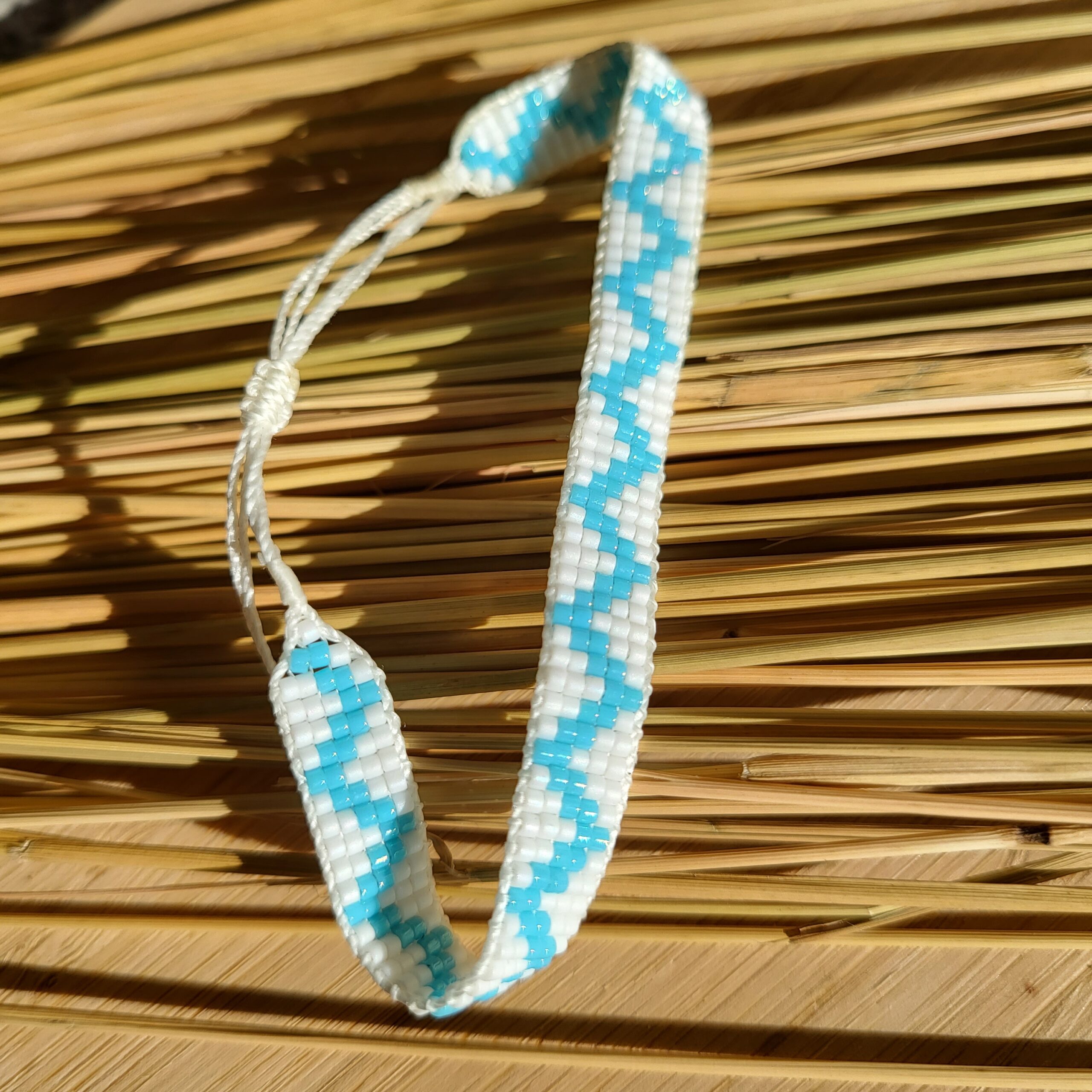 Dit is het eerste armbandje wat ik gemaakt heb met Delica’s. Vanaf het begin dat ik ging werken met Miyuki kralen hadden de Rocailles mijn voorkeur vanwege het speelse effect. Bij een bestelling van nieuwe kralen kreeg ik een gratis gift. Dat waren Delica’s. Miyuki Delica’s zijn buisvormige kralen die een strak patroon geven als ze geweven worden. Meer informatie kun je vinden onder het tapblad: over Miyuki kralen.