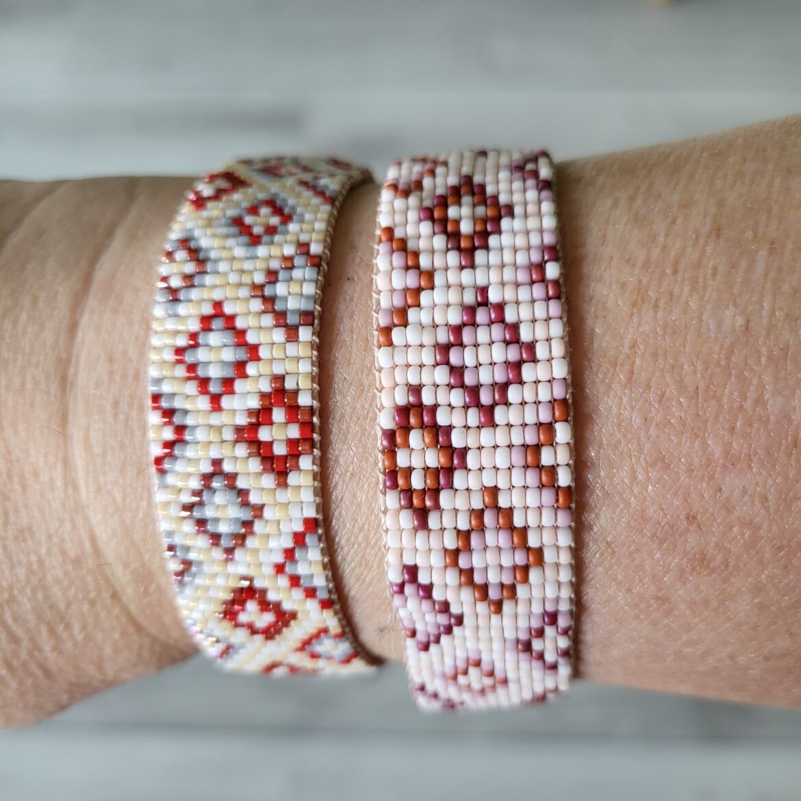 Als je goed inzoomt, zie je het verschil tussen het ruitpatroon met delica-kralen en rocaille-kralen. De delica’s zijn bijna vierkant en kleiner dan de rocailles, maar sluiten daarentegen wel mooier aan. Ik heb altijd gezegd dat ik het liefst werk met rocailles, en dat was ook zo in het begin. Het slangenschilderij is perfect om met rocailles te maken. Maar nu ik deze twee armbanden naast elkaar heb gelegd, moet ik eerlijk bekennen dat het strakke/gladde van de delica’s toch echt wel mooier is bij deze armbanden. Maar meningen verschillen. Misschien vind jij het juist wel mooier met rocailles.