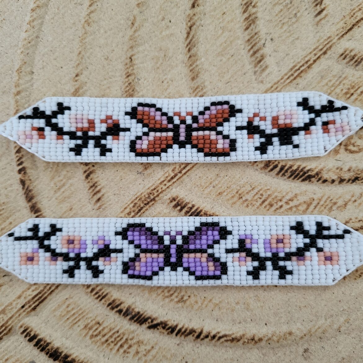 De opdracht kwam van een terugkerende klant. Ze had deze afbeelding gezien en wilde dit graag in een geweven armband verwerkt zien. Haar pols is slank, dus had ik niet veel speling om de takken rondom de vlinder uitgebreid te maken. Uiteindelijk zijn we allebei blij met het eindresultaat.