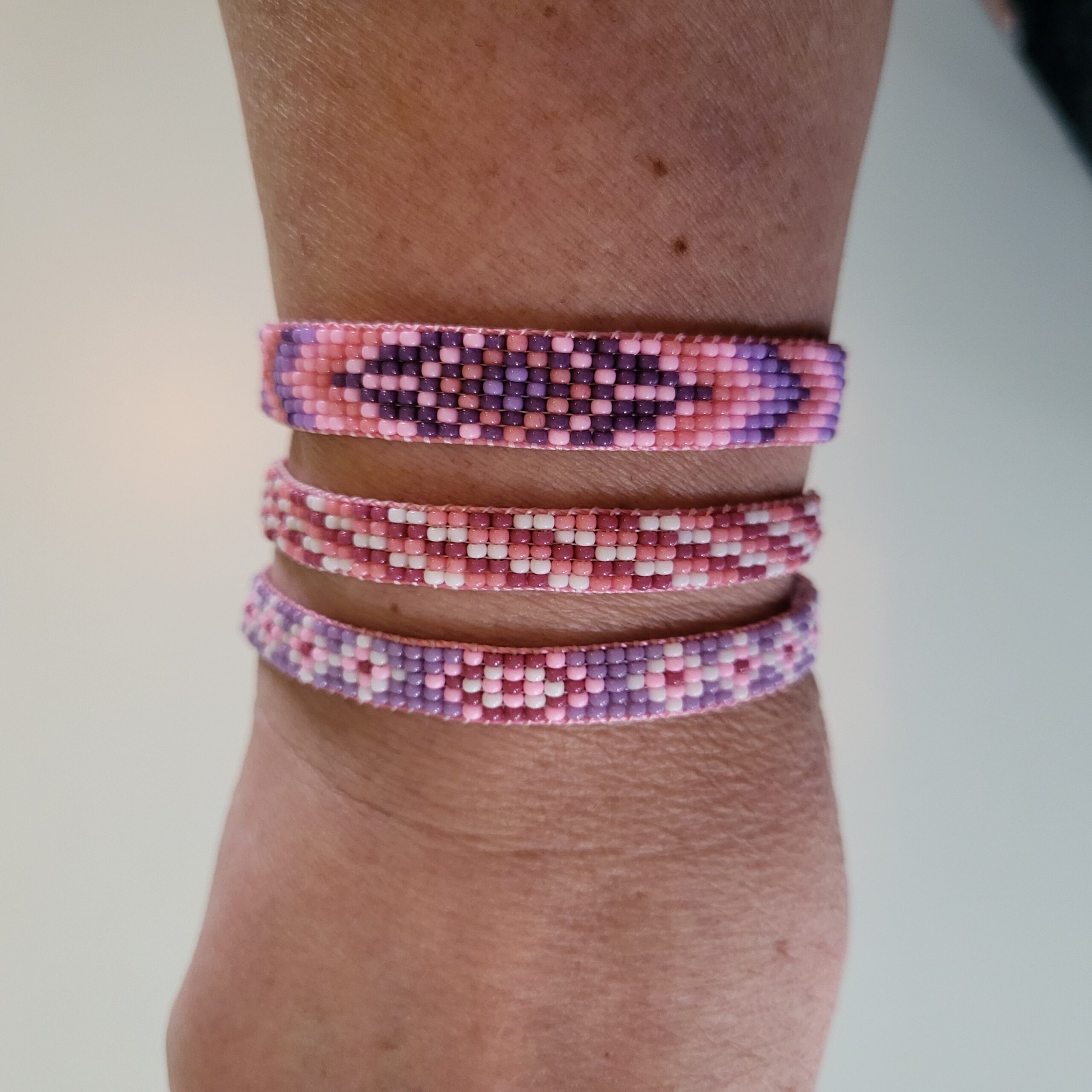 Deze drie armbanden zijn tot stand gekomen vanuit een totaal andere benadering. Normaal werk ik aan de hand van een patroon wat ik in mijn hoofd heb zitten. Deze keer had ik eerst de kleurencombinatie gemaakt. Spelen met kleuren en patronen is een hele fijne vrije vorm van creatief bezig zijn.