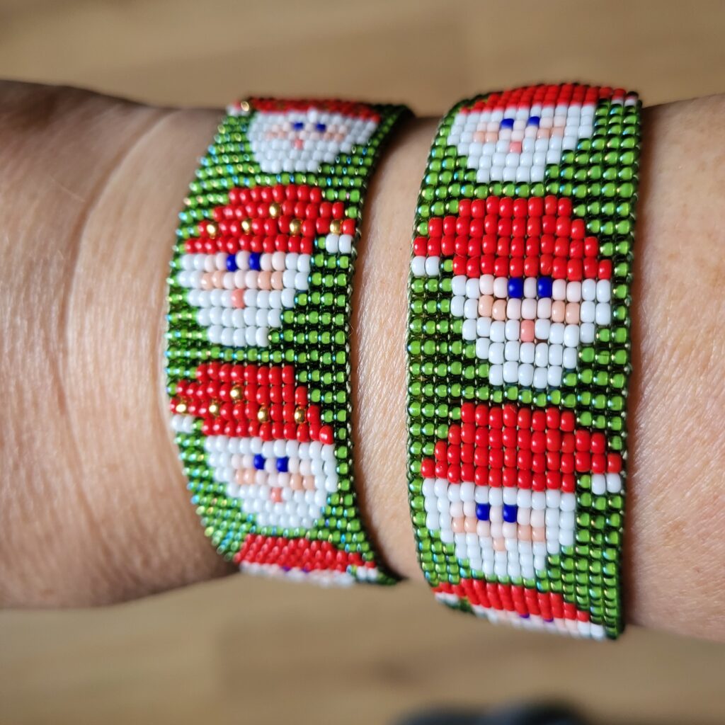 Al mijn armbanden zijn door mezelf gecreëerd. Soms kom ik ergens een patroon tegen dat ik erg leuk vind. Ik probeer er altijd wel een eigen draai aan te geven zodat hij ook echt van mij is. Bij het ontwerpen van deze Kerstman wilde ik wat extra details kunnen aanbrengen. Met een armband van 15 rijen is dat namelijk mogelijk. Ik heb de Kerstman was blosjes op de wangen kunnen geven. Uiteindelijk moet hij ook de kou in om kadootjes af te leveren.
