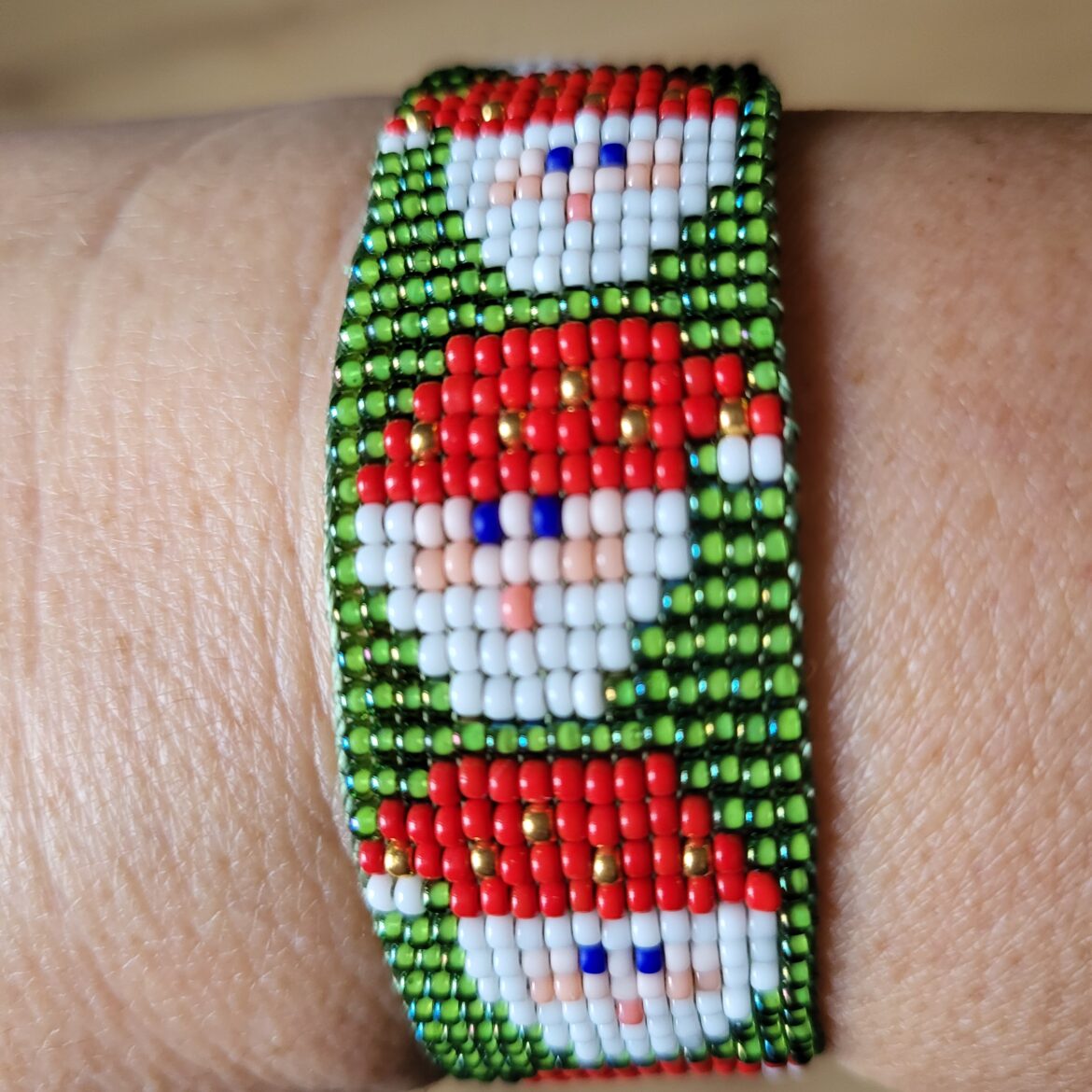 Al mijn armbanden zijn door mezelf gecreëerd. Soms kom ik ergens een patroon tegen dat ik erg leuk vind. Ik probeer er altijd wel een eigen draai aan te geven zodat hij ook echt van mij is. Bij het ontwerpen van deze Kerstman wilde ik wat extra details kunnen aanbrengen. Met een armband van 15 rijen is dat namelijk mogelijk. Ik heb de Kerstman was blosjes op de wangen kunnen geven. Uiteindelijk moet hij ook de kou in om kadootjes af te leveren.