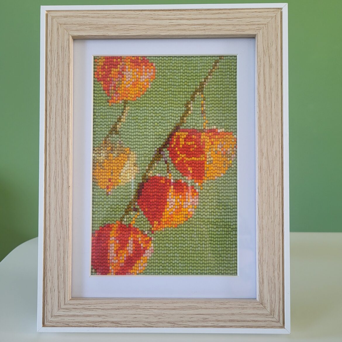 Een van mijn grotere werken is dit handgeweven schilderij van een papegaai in een donkere vorm. Geen diamant painting! …